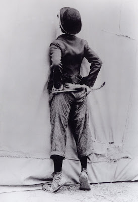 Le Père Noël est en passe de troquer sa dégaine nordique contre une allure clodo grunge légendaire : une paire de galoches démesurées, un pantalon qui baille aux fesses, une veste et une cravate élimées, une chemise dont l’immaculé doute beaucoup, un chapeau très melon accompagnée d’une canne qui danse si bien dans les airs qu’elle semble élastique. Le tout en noir et blanc façon grain muet. Bref, une élégance « aristocrate de la gouttière » qui défie les modes cinématographiques.