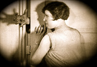 La jeune fille recule vers l’intérieur de la chambre, suivie par le personnage toujours dans la même attitude. Subitement, elle a un geste énergique pour lui séparer les bras, se libérant ainsi du contact entreprenant.